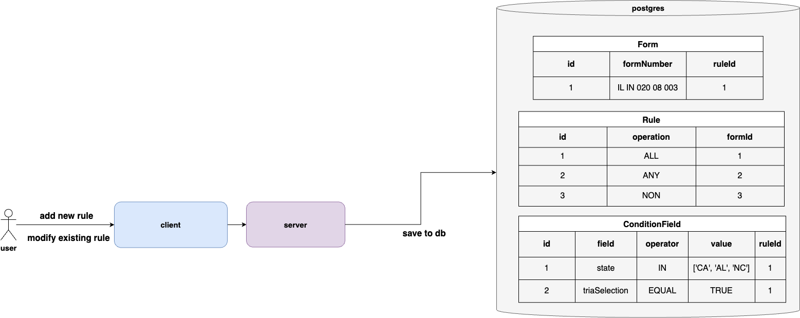 Initially, we stored everything in a JSON column within a single rules table, thinking it would provide flexibility with nested structure, reduce the number of joins in our queries, and make it even easier to integrate with our open-source library. However, as we iterated on the architecture and began expanding the system, we realized that this approach tightly coupled the flexibility of the engine to the rule itself. As the rules became more complex, updating the JSON column became cumbersome, and we saw limitations in how easily we could adapt the system for future enhancements, such as nested conditions.